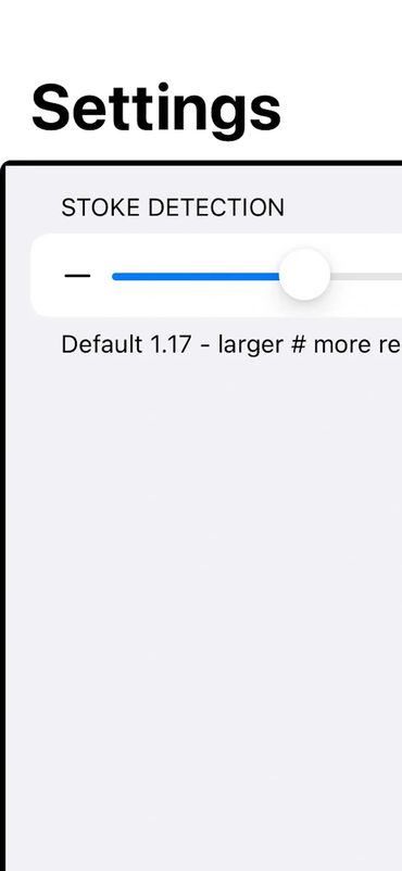 Clicking the gear icon on the bottom of the app will bring up the Settings/Stroke Detection screen. There is a slider control that adjusts the stroke detection sensitivity. A setting of 1.17 is the default but you may need to vary the level based on your stroke pressure. The higher the number the more the resistance.